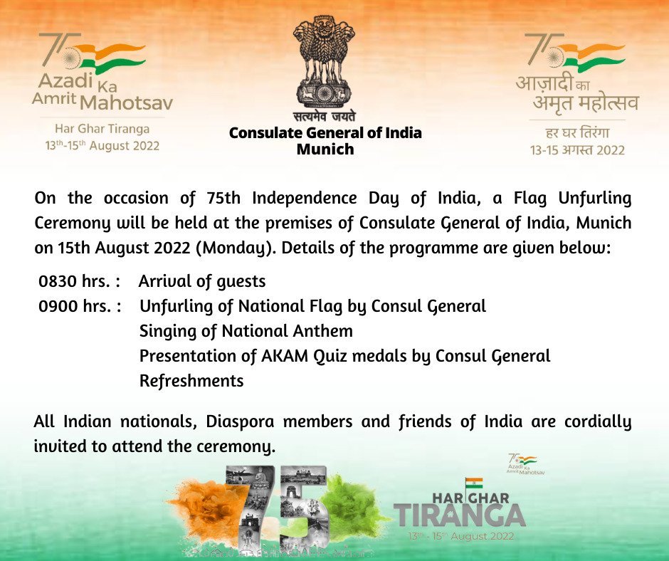 On the occasion of 75th Independence Day of India, a Flag Unfurling Ceremony will be held at the premises of Consulate General of India, Munich on 15th August 2022 (Monday).