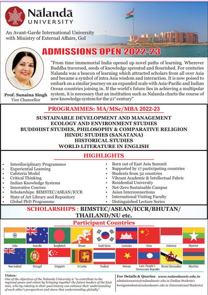 Admission for Masters’ programmes for the academic session 2022-2023 is now open for Nalanda University!