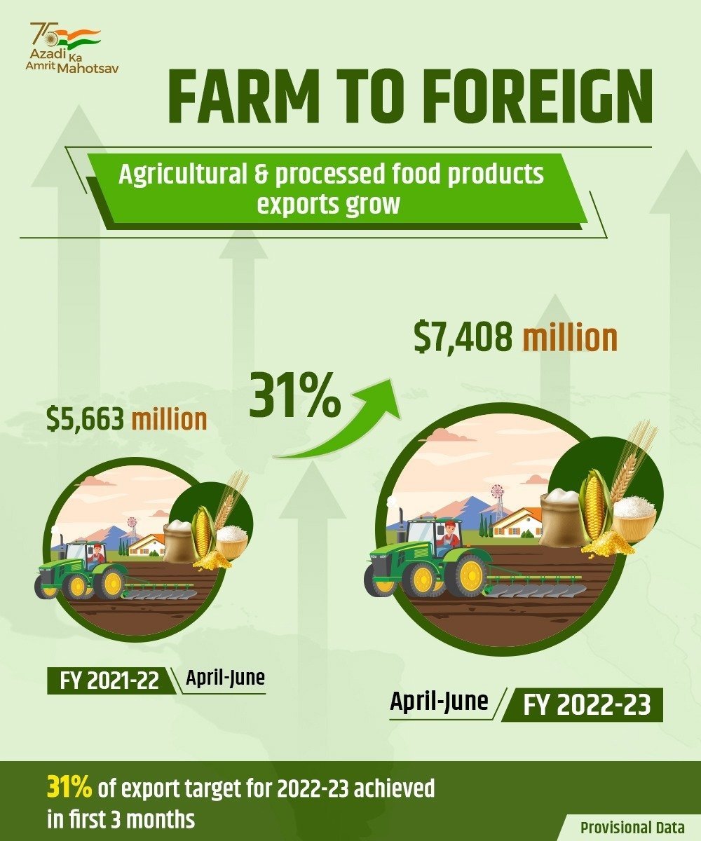 India emerges as a hotspot of opportunities as it sees a 31% jump in the export of agricultural & processed food products in the first 3 months of current fiscal (2022-23) compared to the same period last year.