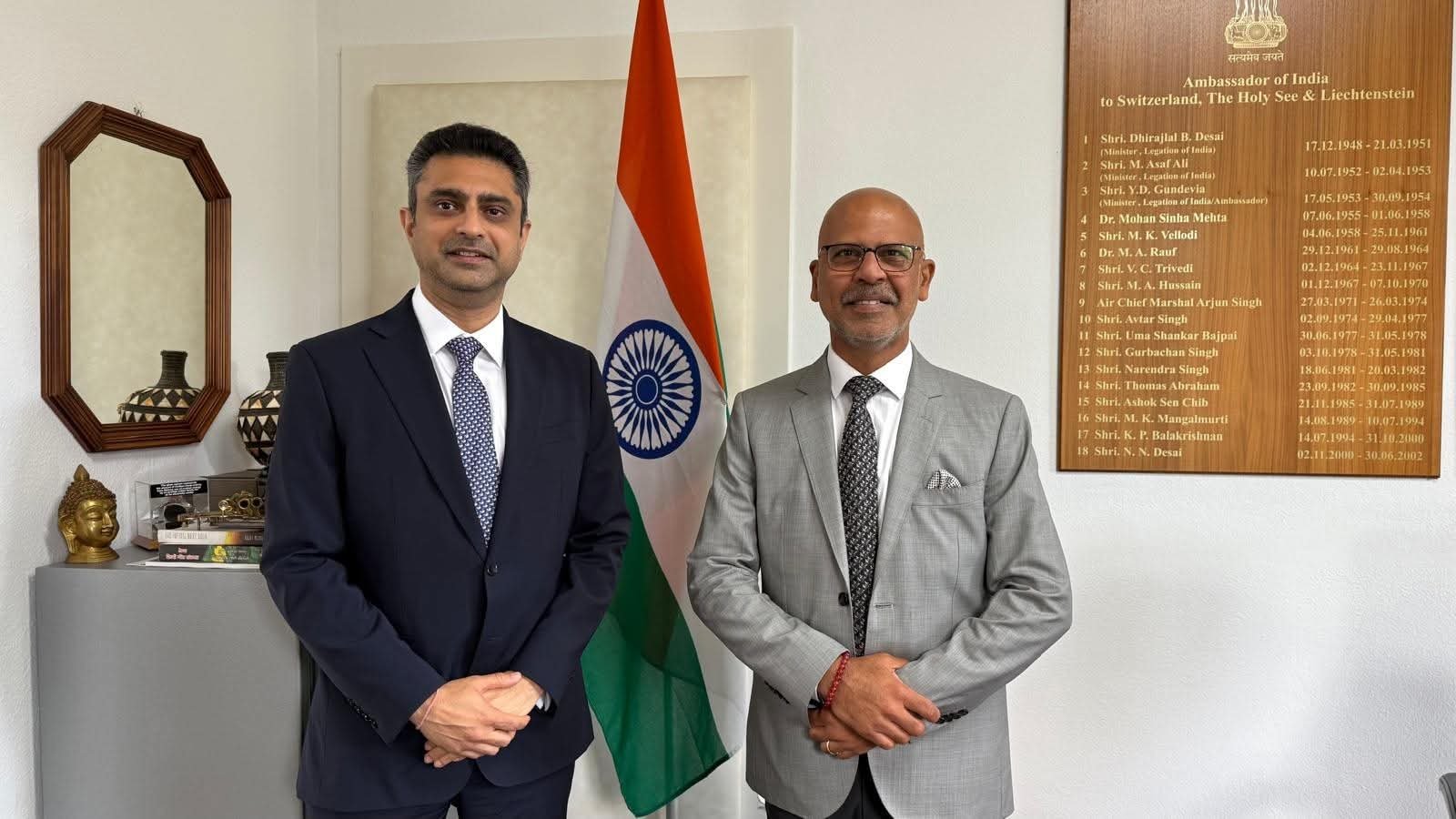 Ambassador Kumar welcomed Mr. Anirudh Singh, COO–Europe & CIS at VFS Global, to the Embassy of India in Switzerland & Liechtenstein. Their discussions focused on improving the user experience, upgrading facilities at the VFS centre, and ensuring better services for the Indian diaspora and other applicants.