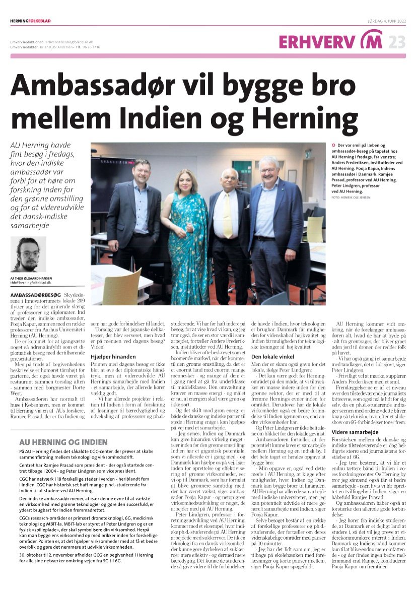 Ambassadør Pooja Kapurs besøg på Aarhus Universitet for at diskutere samarbejde inden for uddannelse, teknologi og startups blev dækket af det danske dagblad HerningFolkebald i sin grundlovsdag weekendudgave.