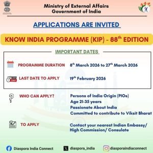 The 88th edition of the Know India Programme (KIP) is open for Persons of Indian Origin (PIO), aged 21–35 years, who are passionate about exploring India’s heritage, culture and development.