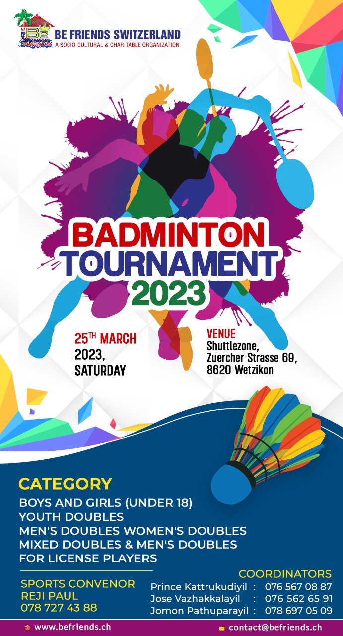 The Badminton Tournament organized by B Friends Switzerland for years to promote friendship, sports and health care more than competition, will be held this year on Saturday, March 25, at Vet Sikon in Zurich. Will be conducted in the shuttle zone. Contact Sports Convenor and Coordinators for registration of competitions in various categories