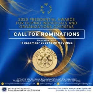 Nominations are now OPEN for the 2026 Presidential Awards for Filipino Individuals and Organizations Overseas (PAFIOO), as announced by the Commission on Filipinos Overseas.