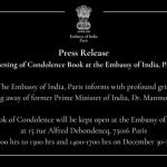 Embassy Of India In Paris Will Held Opening Of Condolence Book On December 30-31.