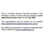 Consular Services at the Embassy of India in Rome to Operate by Appointment Only from 21 July 2025.