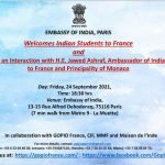 Embassy of India in Paris invites Indian Students for an interaction with H.E Jawed Ashraf on 24th Sept 2021