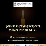 Join us in Praying Respects to Lives Lost on AI171 Crash on 16th June at India House, London.