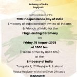Celebrate 79th Independence Day Flag Hoisting on 15th August in Reykjavik.