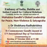 On the occasion of the 153rd birth anniversary of Mahatma Gandhi Embassy will host a virtual talk titled Mahatma Gandhis Global Leadership for Peace Non-Violence & Satyagraha