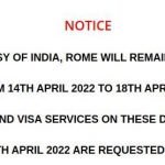 embassy of india rome will remain closed from 14th april 2022 to 18th april 2022