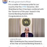 The RBI Governor Shri Shaktikanta Das Ji has been conferred with the Governor of the Year Award in the Central Banking Awards 2023