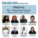 DAAD 𝐨𝐫𝐠𝐚𝐧𝐢𝐳𝐢𝐧𝐠 𝐏𝐫𝐞-𝐃𝐞𝐩𝐚𝐫𝐭𝐮𝐫𝐞 𝐖𝐞𝐛𝐢𝐧𝐚𝐫 𝐒𝐞𝐬𝐬𝐢𝐨𝐧 𝐟𝐨𝐫 𝐚𝐥𝐥 𝐭𝐡𝐞 𝐮𝐩𝐜𝐨𝐦𝐢𝐧𝐠 𝐬𝐭𝐮𝐝𝐞𝐧𝐭𝐬 𝐨𝐧 𝟖𝐭𝐡 𝐍𝐨𝐯𝐞𝐦𝐛𝐞𝐫, 𝟐𝟎𝟐𝟎.