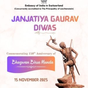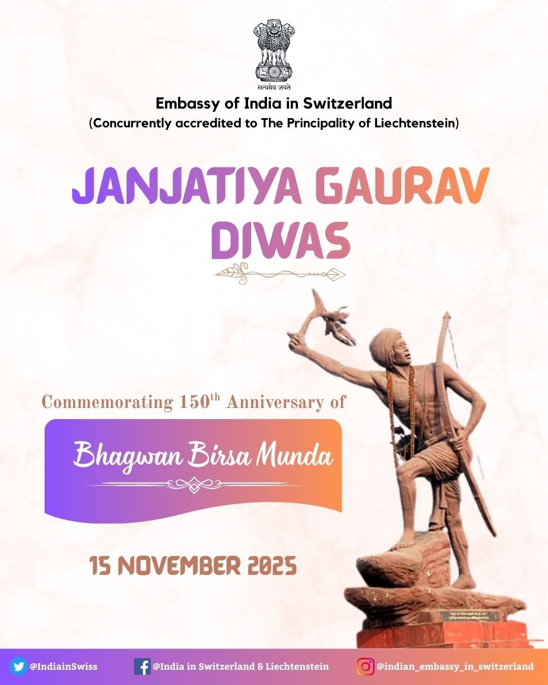 India in Switzerland & Liechtenstein conveys its warm greetings on #JanjatiyaGauravDiwas, observed on 15 November 2025, as the nation marks the 150th birth anniversary of Bhagwan Birsa Munda, one of India’s most revered tribal freedom fighters and social reformers.