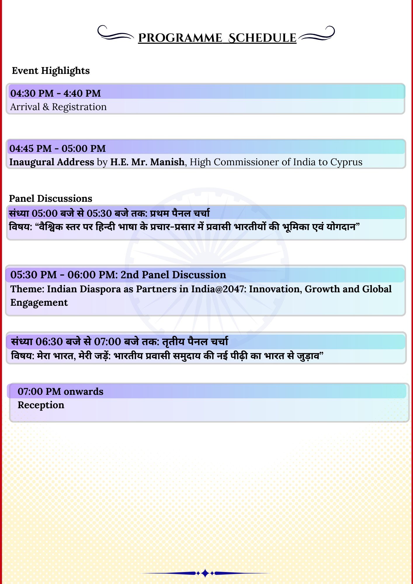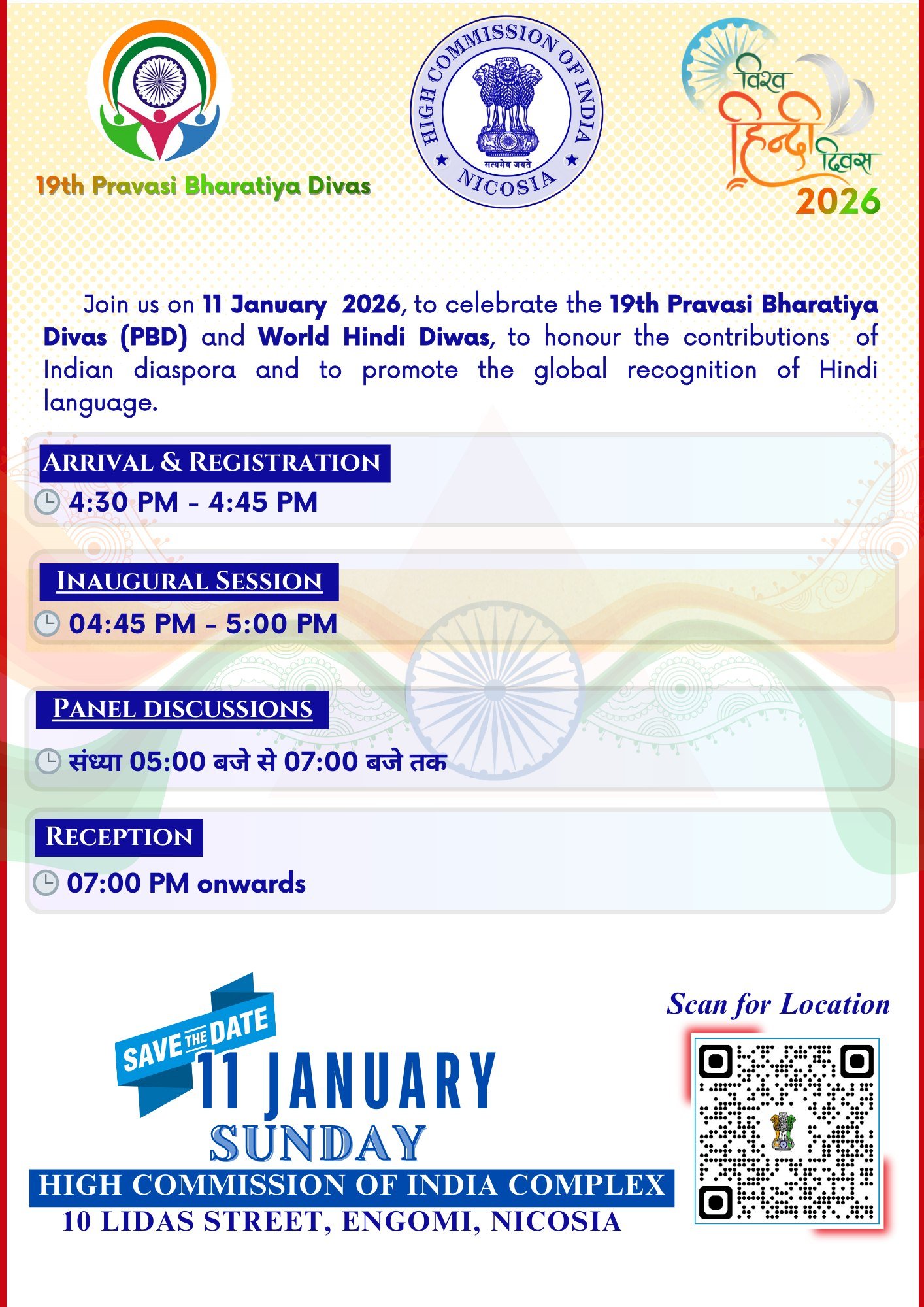 The Indian High Commission, Nicosia cordially invites the migrant Indian community and friends of India to join the celebration of the 19th Pravasi Bharatiya Divas (PBD) and World Hindi Day 2026 ๐ฎ๐ณ