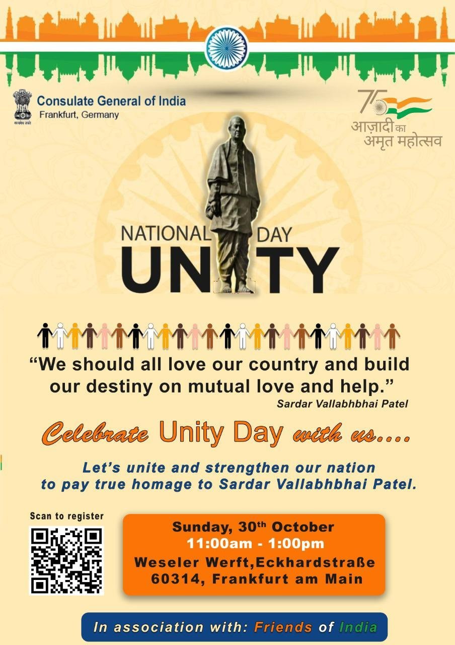 Consulate General of India, Frankfurt in collaboration with various Indian associations in Frankfurt Rhein Main area in Germany and Friends of India welcomes you to join the Unity Day celebrations on 30 October in Frankfurt. For details