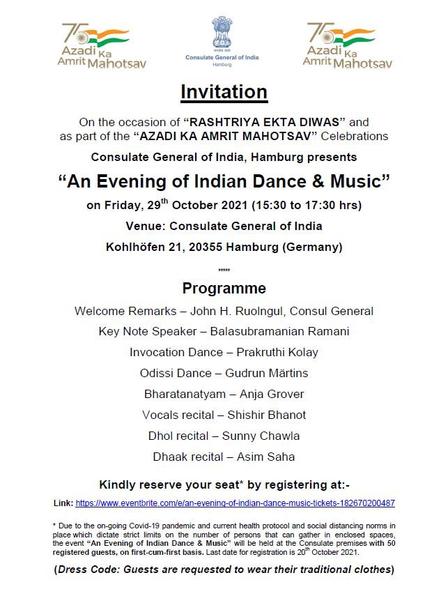 CGI Hamburg invites for An Evening of Indian Dance & Music On the occasion of RASHTRIYA EKTA DIWAS Celebrations on 29th Oct 2021