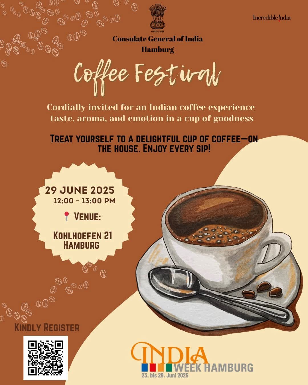 The Consulate General of India, Hamburg warmly invites you to a unique Coffee Festival โ a celebration of the rich taste, aroma, and emotion that Indian coffee brings in every sip.
