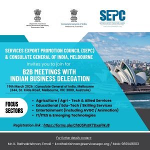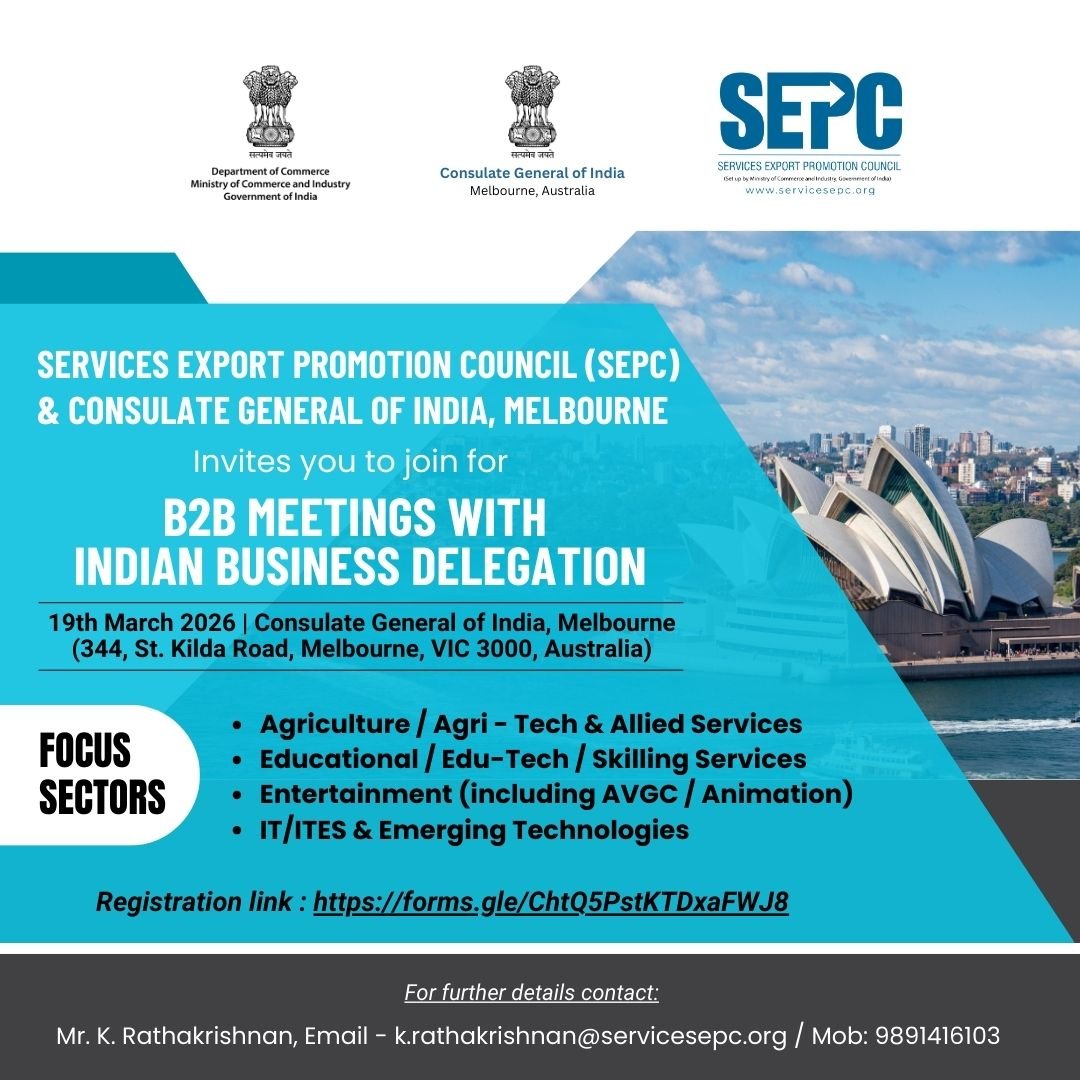 Services Export Promotion Council (SEPC), in collaboration with India in Australia (Consulate General of India, Melbourne), invites Australian businesses and stakeholders to B2B meetings with an Indian Business Delegation on 📅 19 March 2026.