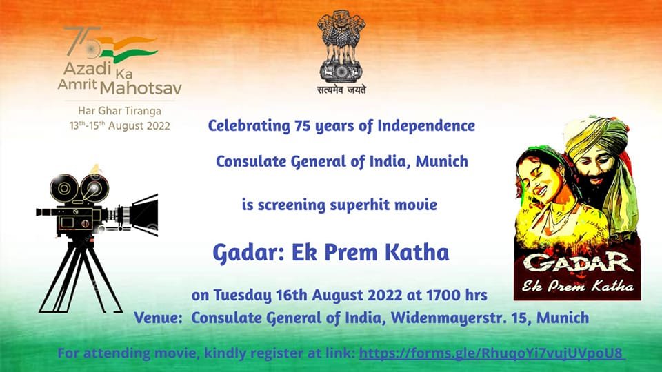 May be an image of text that says "75~ Azadi Ka AmMh Har Ghar Tiranga 13th-15th August 2022 सत्यमेव जयते Celebrating 75 years of Independence Consulate General of India, Munich is screening superhit movie Gadar: Ek Prem Katha on Tuesday 16th August 2022 at 1700 hrs Venue: Consulate General of India, Widenmayerstr. 15, Munich For attending movie, kindly register at link: https//orm.ge/huqo17vujUVpouU8 GADAR Ek Prem Katha"