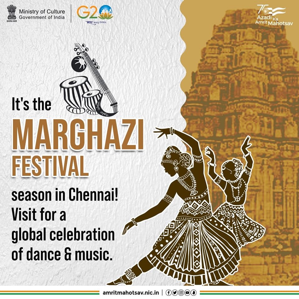 May be an image of text that says "Ministry of Culture Government o India G20 2023ND Azadi AmrMahotsv It's the MARGHAZI FESTIVAL season in Chennai! Visit for a global celebration of dance & music. DWd amritmahotsav.nic.in f..00"