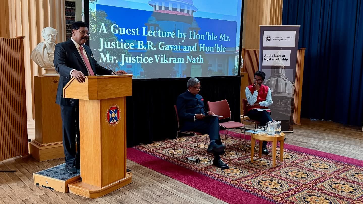 Hon’ble Chief Justice of India, Justice B.R. Gavai, delivered an insightful lecture titled “Constitution as an Evolving Document” at the esteemed Edinburgh Law School, University of Edinburgh. He was accompanied by Hon’ble Justice Vikram Nath, Judge of the Supreme Court of India. The lecture explored the dynamic interpretation of the Constitution, the delicate balance between rights and duties, and the judiciary’s expanding role in a rapidly transforming society.
