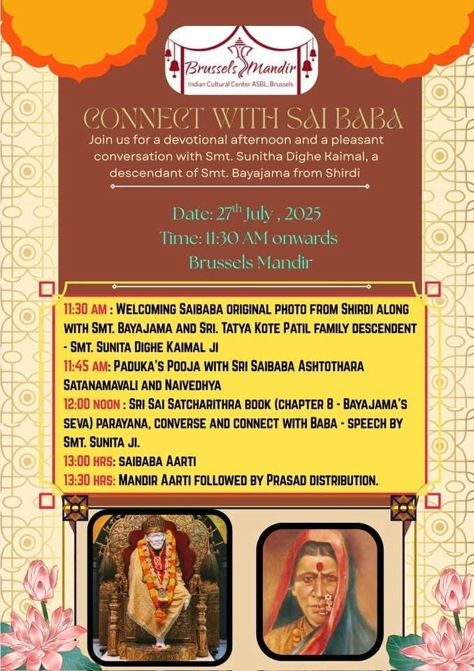 Connect with Sai Baba: A Spiritual Afternoon of Devotion, Legacy & Blessing. Join us on 27th July at Brussels Mandir.
