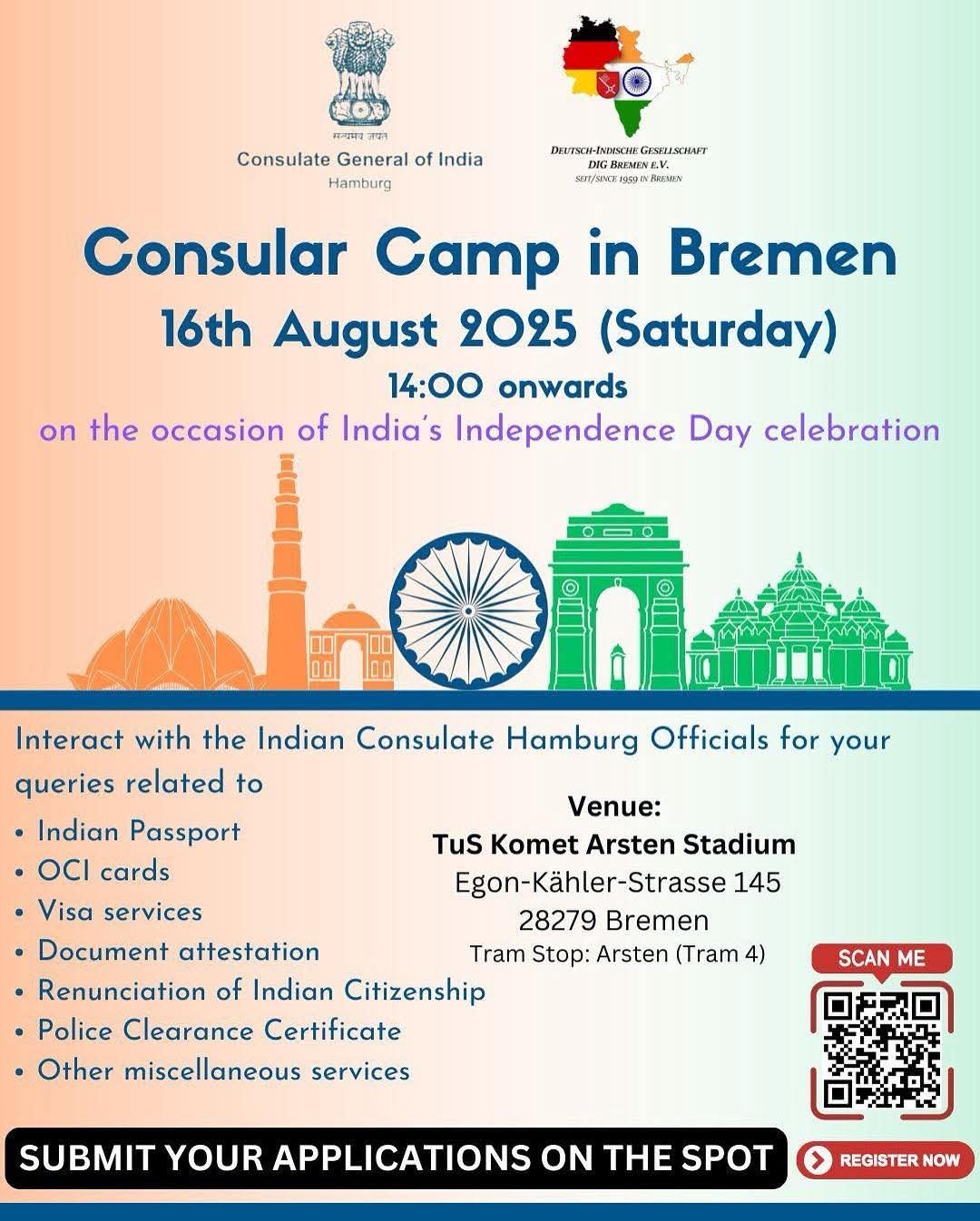 The Consulate General of India, Hamburg, in collaboration with DIG Bremen e.V., is pleased to continue its tradition of bringing consular services directly to the Indian community in Bremen — an initiative successfully running for the past five years. This outreach aims to strengthen engagement with the Indian diaspora while making essential services more accessible.