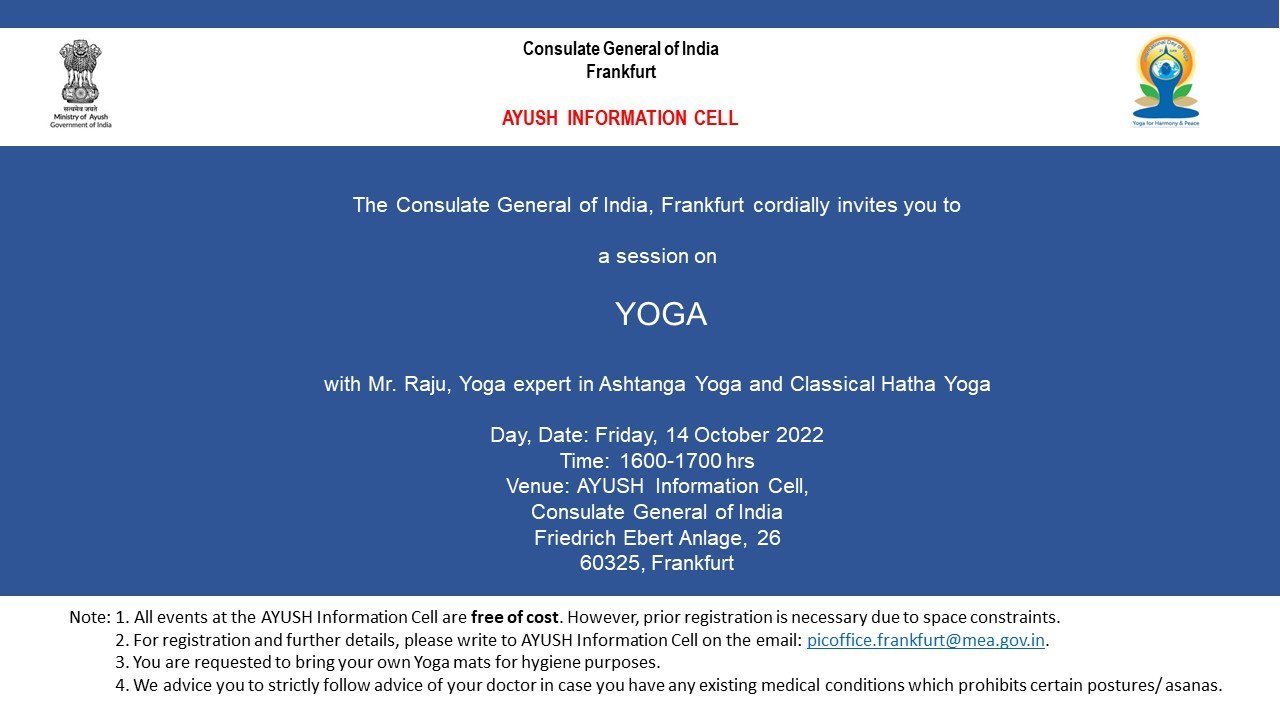 Consulate General of India, Frankfurt is pleased to invite you to join us for our next session of #Yoga‘ to be held on 14th October 2022 between 1600-1700 hrs at the Consulate General of India, Friedrich Ebert Anlage 26, 60325 Frankfurt am Main.