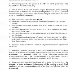This is a great opportunity to work with the Consulate and contribute to official and administrative functions in a dynamic international environment. Interested and eligible candidates are encouraged to apply as per the prescribed guidelines.