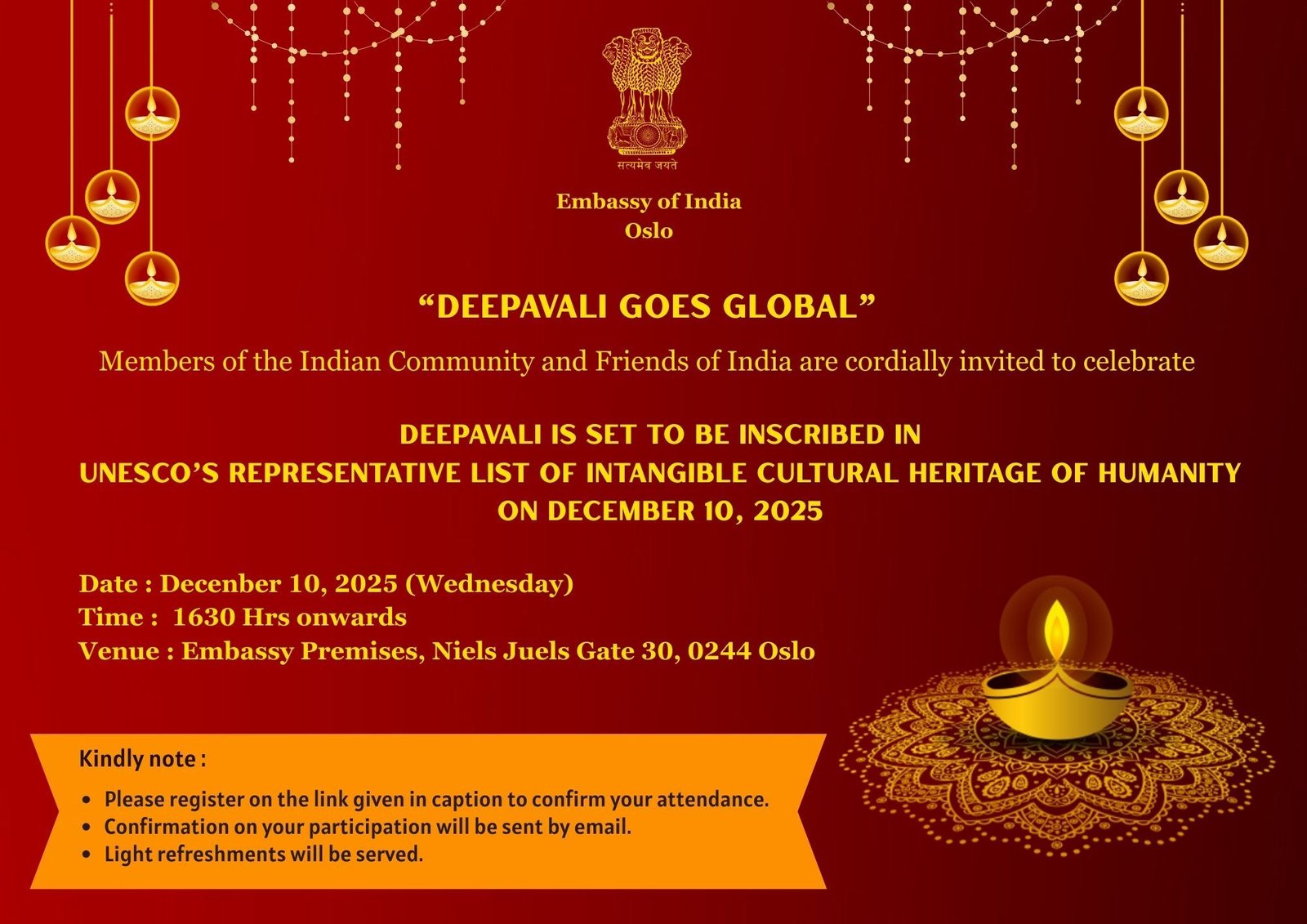 The Embassy of India, Oslo warmly invites members of the Indian community and friends of India to a special gathering on 10 December 2025 from 1630 hrs onwards at the Embassy premises, Niels Juels Gate 30 to celebrate the expected inscription of Deepavali on UNESCO’s Intangible Cultural Heritage List.