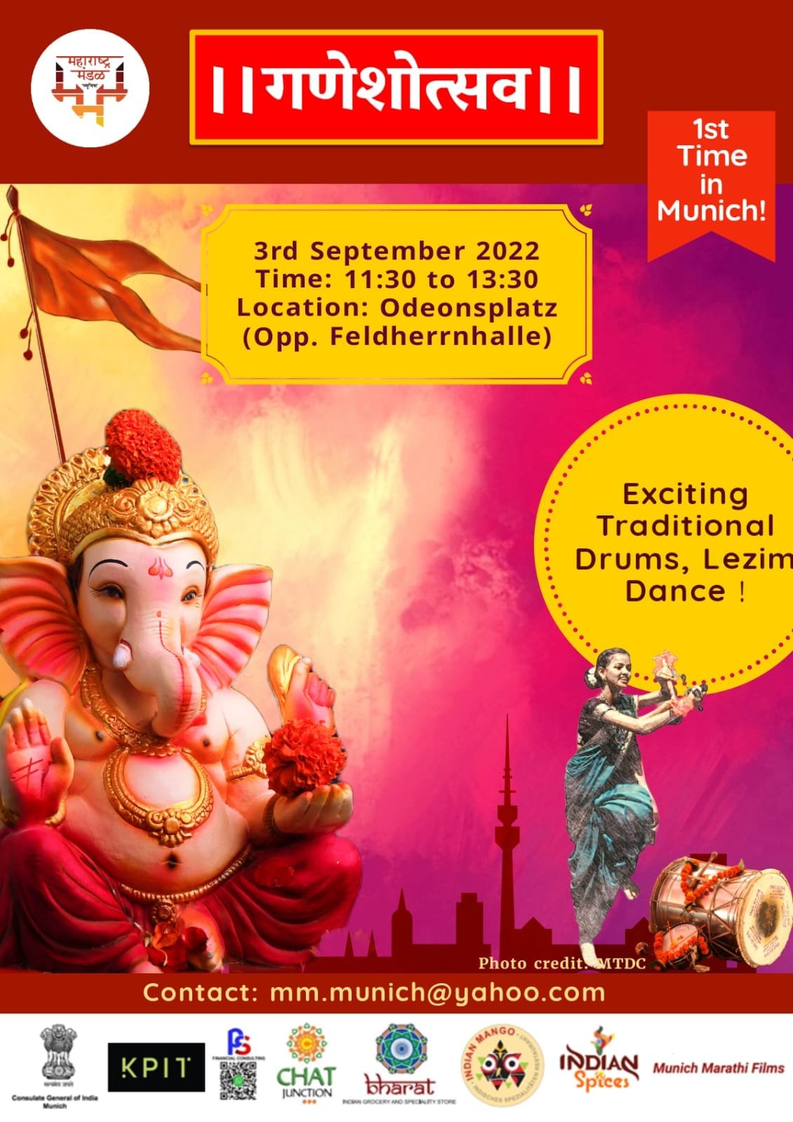 This event will be evidencing energy and devotion with vibrant function including mind blowing Dhol-Tasha-Zanz and Lezim Performance by Ramanbaug Yuwa Manch Germany and Maharashtra Mandal Munich e.V.