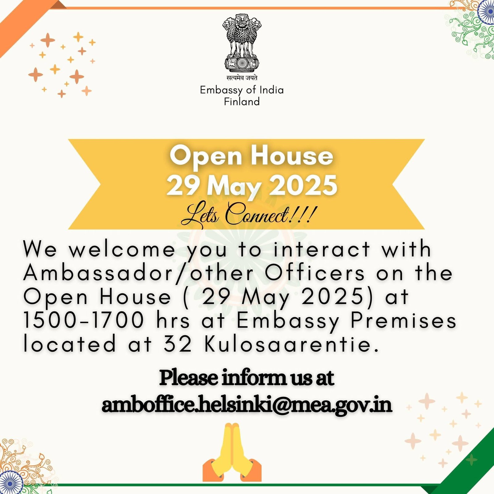 The Embassy of India in Finland warmly invites members of the Indian community and friends of India to an Open House on 29 May 2025 (Wednesday) from 1500 to 1700 hrs at the Embassy premises located at 32 Kulosaarentie, Helsinki.