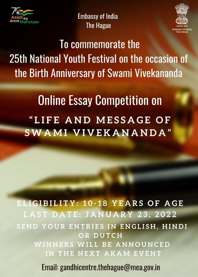 To commemorate the 25th #NationalYouthFestival Embassy of India is organizing an online essay writing competition on “Life and Message of Swami Vivekananda.” Send in your entries before January 23, 2022 to gandhicentre.thehague@mea.gov.in #AmritMahotsav #AzadiKaAmritMahotsav