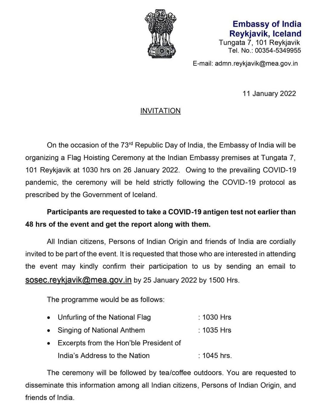 On the occasion of the 73rd Republic Day of India, the Embassy of India will be organizing a Flag Hoisting Ceremony at the Indian Embassy premises at Tungata 7, 101 Reykjavik at 1030 hrs on 26 January 2022. Owing to the prevailing COVID-19 pandemic, the ceremony will be held strictly following the COVID-19 protocol as