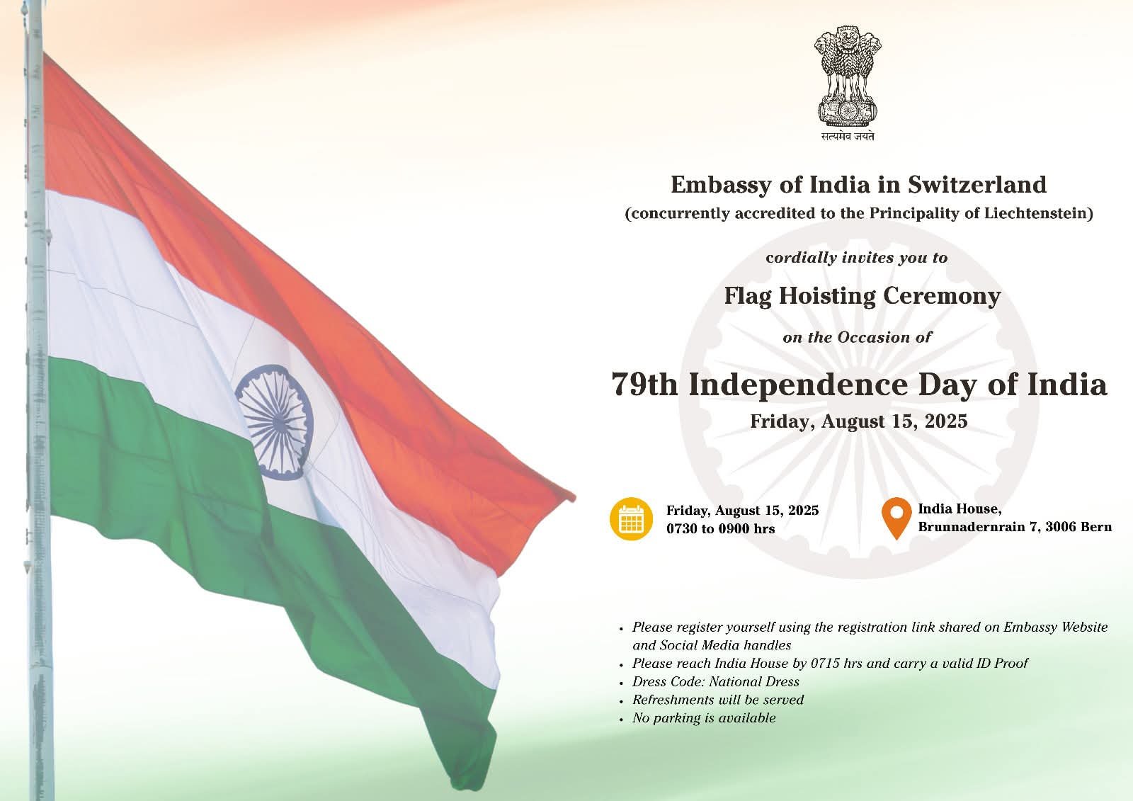 The Embassy of India in Switzerland (also accredited to the Principality of Liechtenstein) warmly invites you to the Flag Hoisting Ceremony on the occasion of Indiaโ€™s 79th Independence Day.