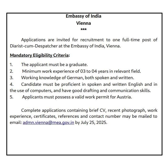 The Embassy of India in Vienna is inviting applications for a full-time position of Diarist-cum-Despatcher.