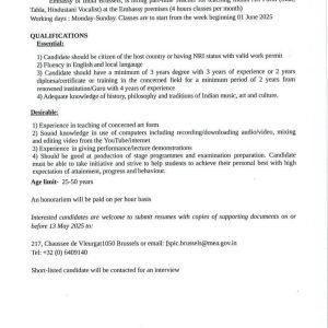 We’re looking for part-time teachers in Indian Art Forms to conduct classes at the Embassy premises—starting soon!