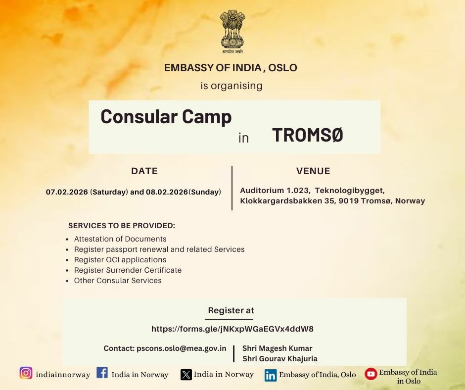 As part of its community outreach initiatives, the Embassy will organise a Consular Camp for the Indian diaspora in Tromsø and nearby areas to address various consular requirements.
