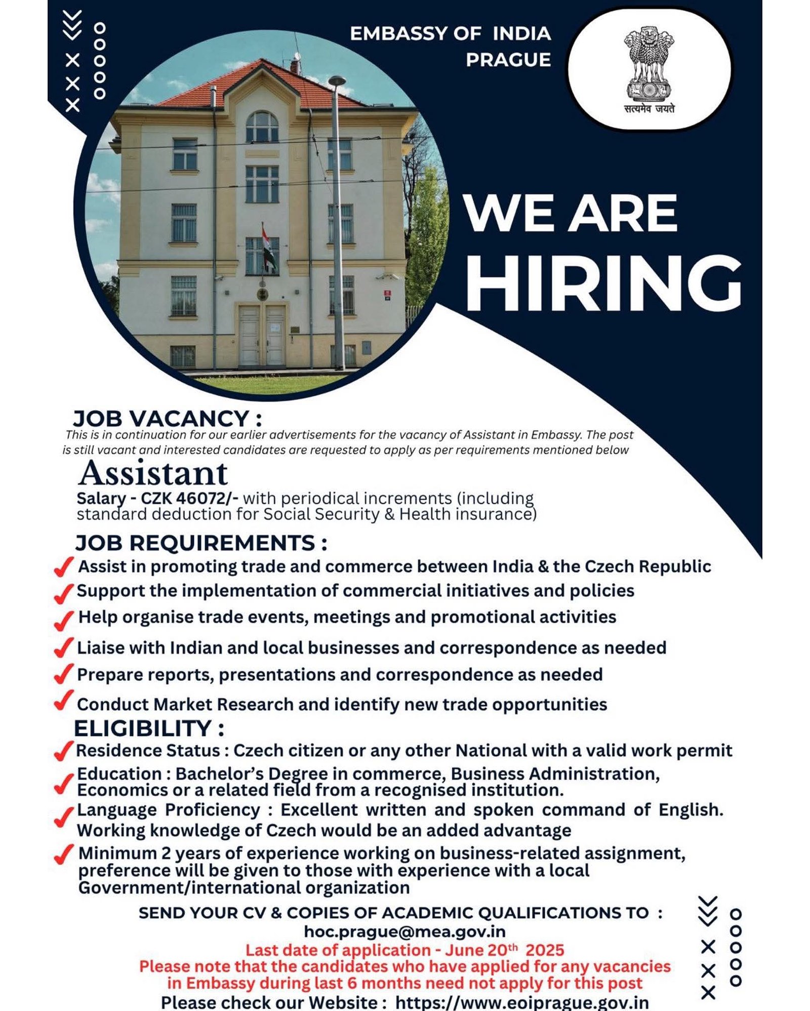 📩 Interested candidates are requested to send their CV and a cover letter by June 20, 2025 to: hoc.prague@mea.gov.in