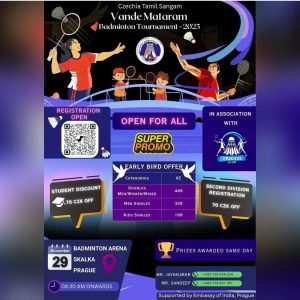 The Czechia Tamil Sangam, with the support of the Embassy of India, Prague, successfully hosted the Vande Mataram Badminton Tournament 2025 — bringing together kids, students and adults for an exciting celebration of fitness, teamwork and togetherness.