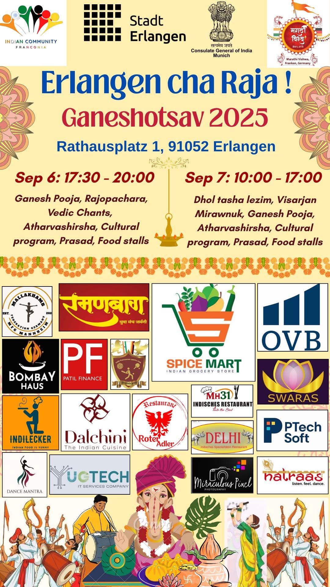 The Indian Community Franconia (ICF), in association with Stadt Erlangen, the Consulate General of India, Munich, and Marathi Vishwa Franken, Germany, cordially invites you to celebrate Erlangen cha Raja – Ganeshotsav 2025