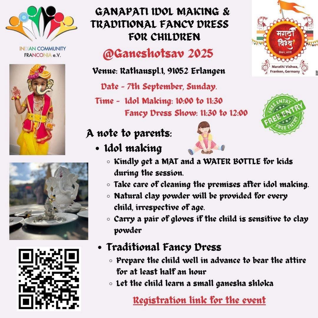 The Indian Community Franconia e.V. in association with Marathi Vishwa Franken, Germany cordially invites you and your little ones to participate in Ganapati Idol Making & Traditional Fancy Dress for Children as part of @Ganeshotsav 2025.