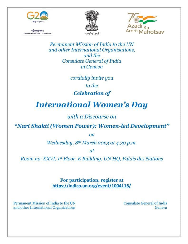 Indian Association of Geneva is happy to invite you to the International Women’s Day celebrations. As part of Azadi Ka Amrit Mahotsav, celebrating the unique milestone of 75 years of India’s independence, the Permanent Mission of India to the UN and other International Organisations, and the Consulate General of India, Geneva have planned to celebrate International Women’s Day with a Discourse on “Nari Shakti (Women Power): Women-led Development”