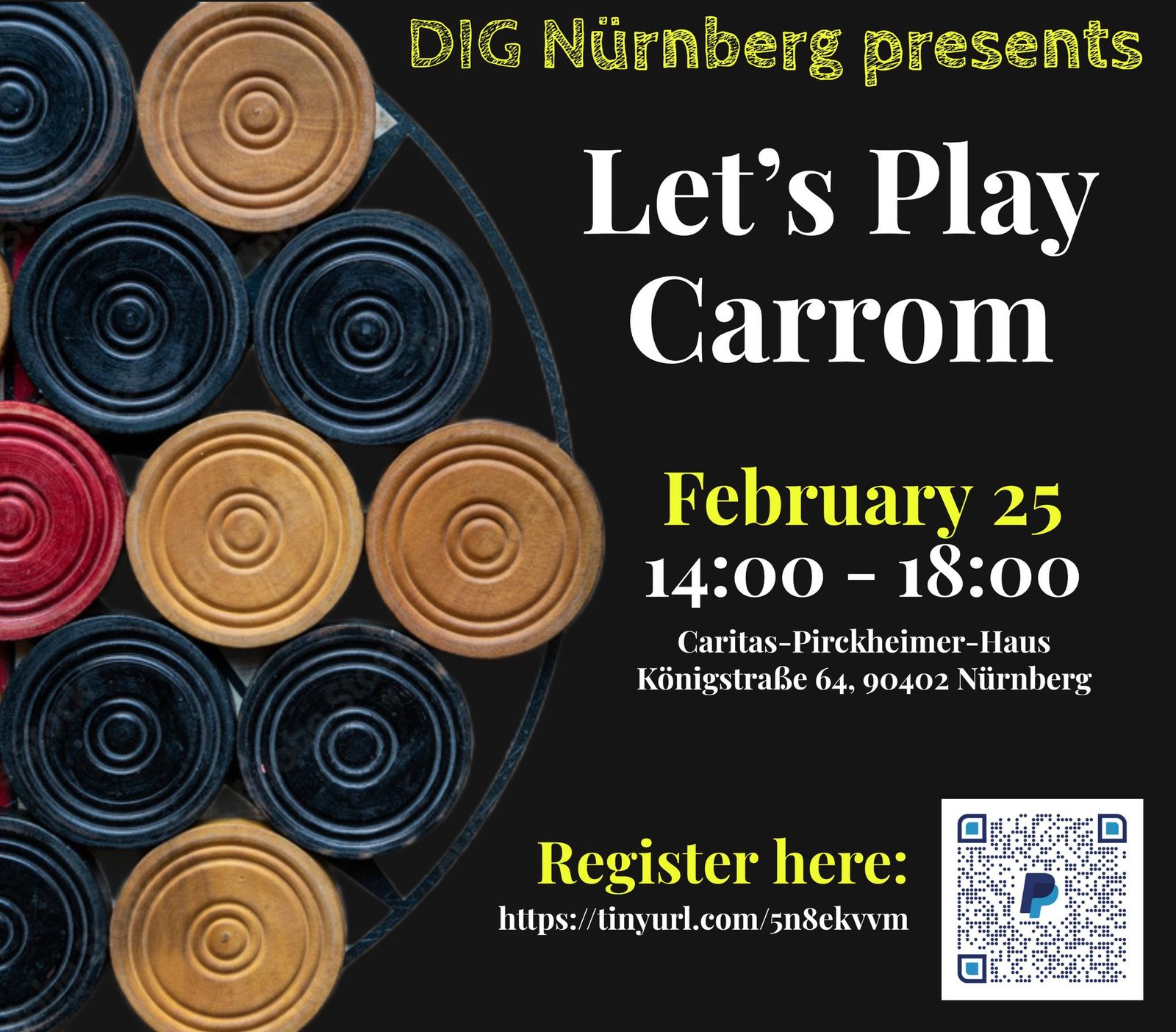 Get ready on this weekend for an amazing time with the most vibrant community in Nürnberg! Let’s come together and enjoy the thrilling game of Carrom while surrounded by the city’s heart and soul. Whether you’re a seasoned pro or just starting out, everyone is welcome to join in on the fun. Register Here: https://tinyurl.com/5n8ekvvm