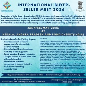 The Federation of Indian Export Organisations (FIEO), in partnership with State Governments, invites global buyers to participate in the International Buyer–Seller Meet 2026 across Kerala, Andhra Pradesh and Pondicherry, India.