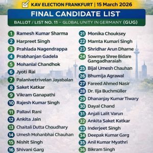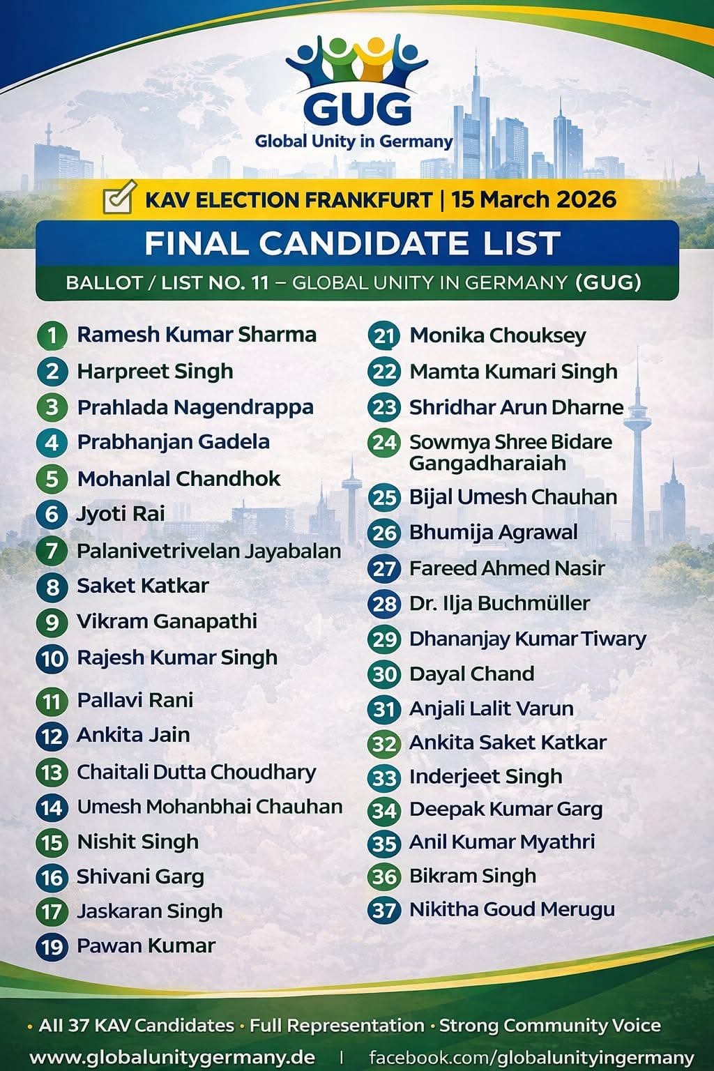 Frankfurt am Main, Germany – Global Unity in Germany (GUG) has officially announced its final list of candidates for the 2026 KAV (Ausländerbeirat) Elections in Frankfurt, scheduled to take place on 15 March 2026. With a diverse and dynamic team of 37 candidates, GUG aims to strengthen representation, promote integration, and ensure meaningful participation of international communities in Frankfurt.
