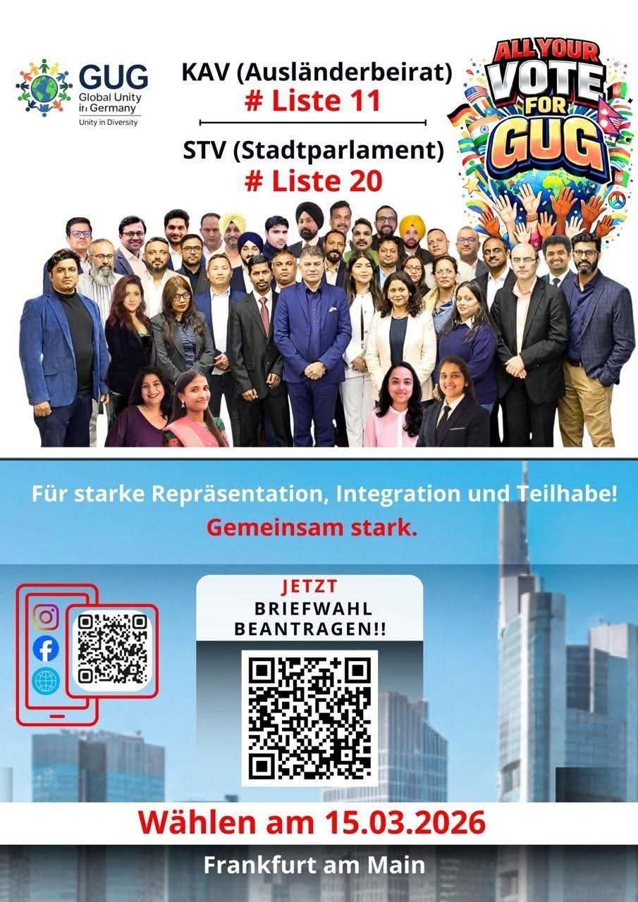 GUG represents the spirit of “Unity in Diversity”, bringing together individuals from various professional, cultural, and community backgrounds who are committed to serving Frankfurt’s multicultural population. The organization is contesting the KAV elections under List #11, while also supporting representation in the Stadtverordnetenversammlung (STV) under List #20.