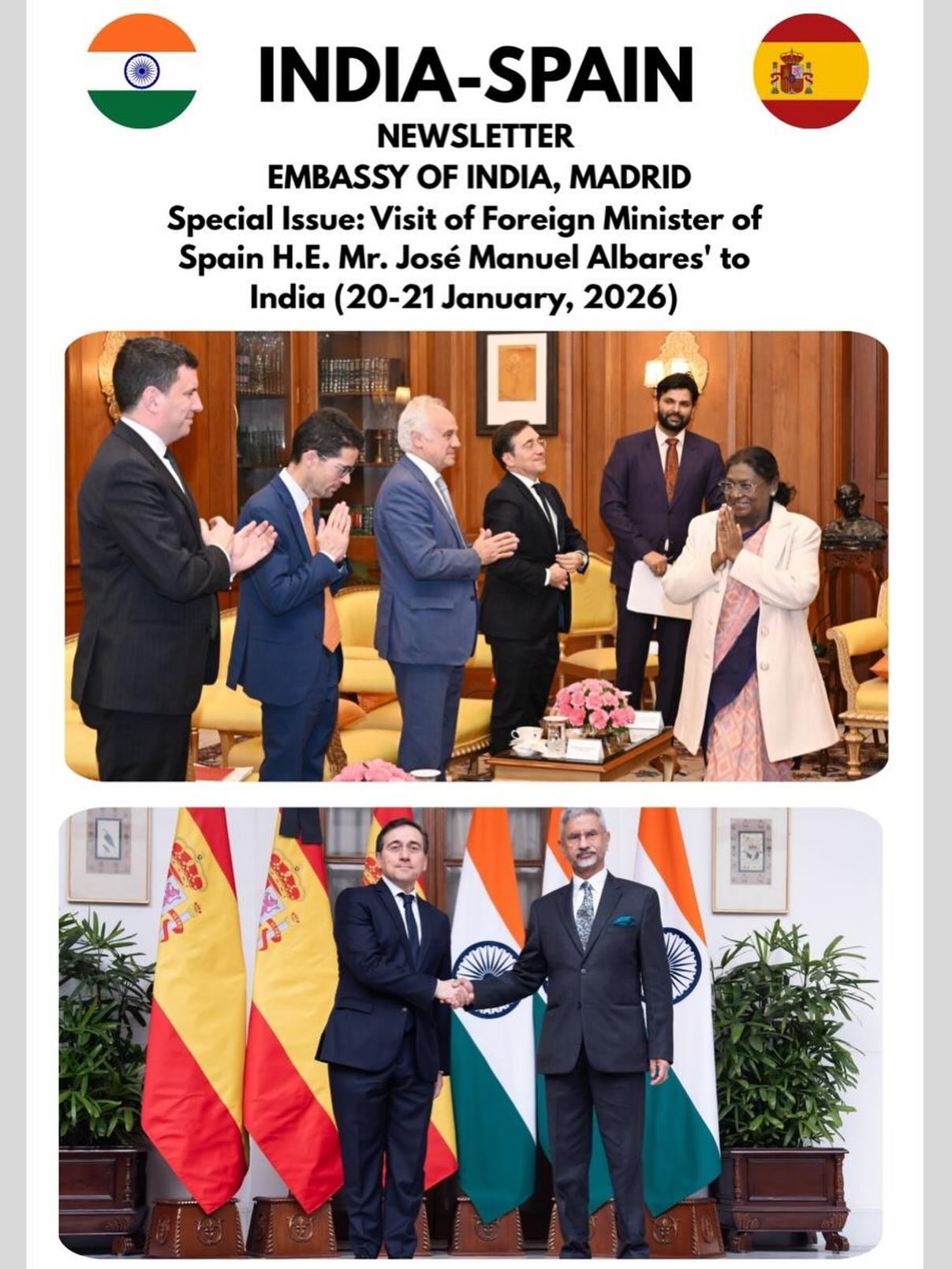 We are delighted to share the Special Edition of our newsletter, commemorating the official visit of H.E. Mr. José Manuel Albares, Minister of Foreign Affairs of Spain, to New Delhi on 20th and 21st January 2026, at the invitation of Hon’ble External Affairs Minister @DrSJaishankar.