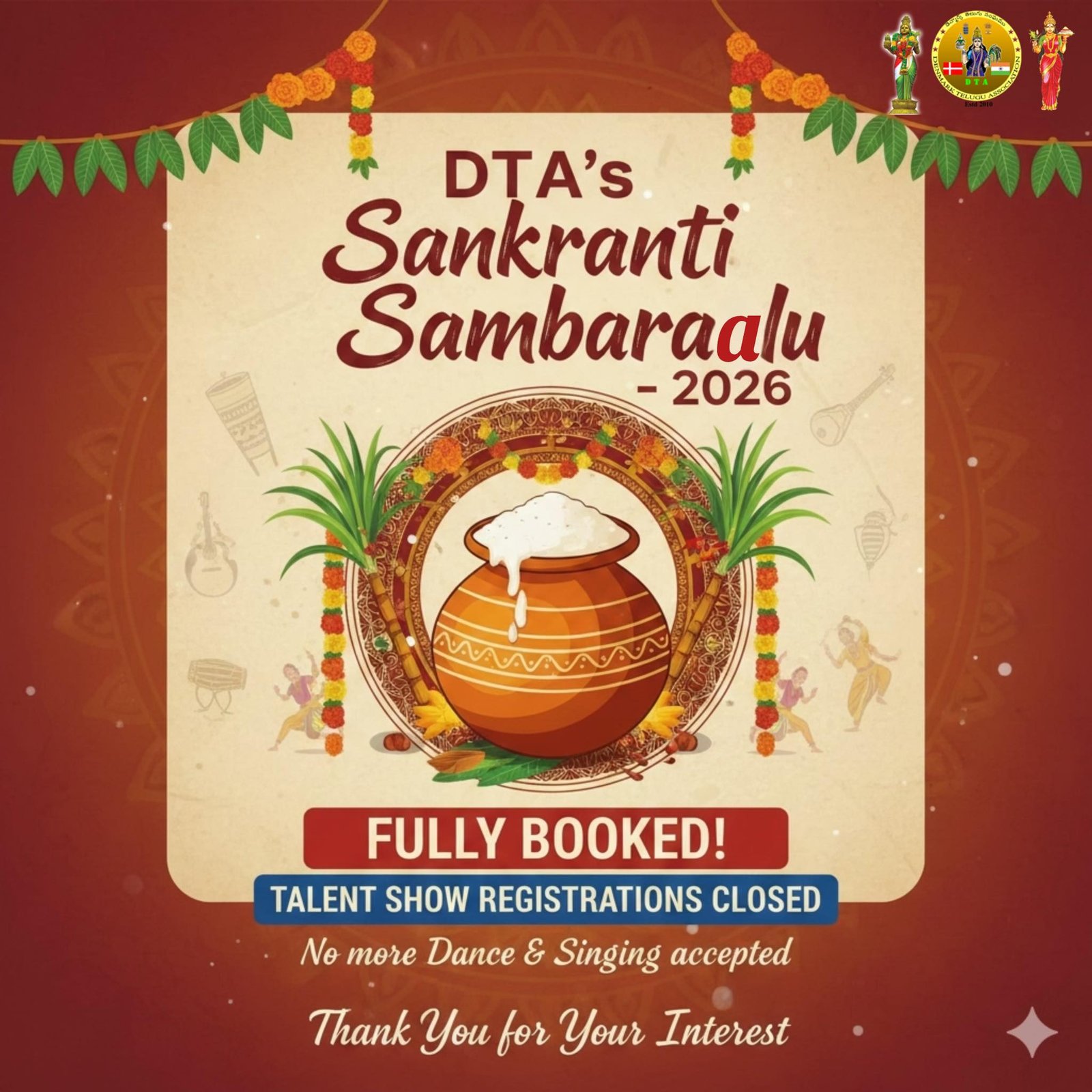 We’re delighted by the overwhelming response! The Talent Show for DTA’s Sankranti Sambaraalu 2026 is now fully booked, and registrations are officially closed.
